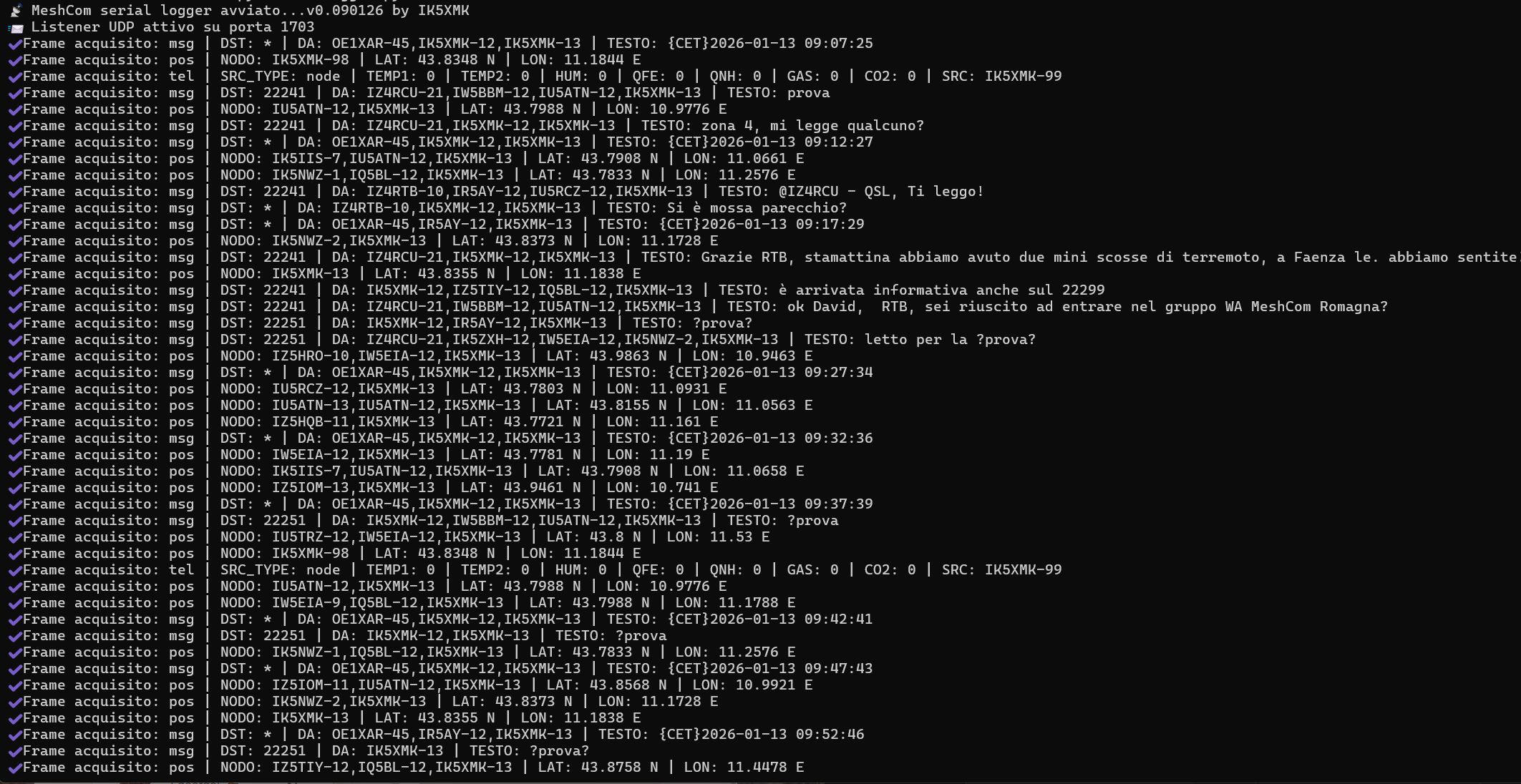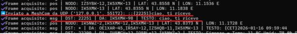 Adesso procediamo con la configurazione (file config.json che deve essere presente nella stessa directory del programma) del logger impostando la porta seriale in uso, il nominativo radioamatoriale che stiamo usando sulla scheda lora e il percorso (path) del database. Di default lo crea nella directory ove è presente logger. Per informazione, se modifichiamo il path, questo dovrà essere del tipo “C:\\Users\\user.user-PC\\Desktop\\meshcom.db” (attenzione alle \\). Consiglio di posizionare tutti i programmi in una cartella sul desktop. Eseguiamo il programma (esegui_logger.bat) e attendiamo che riceva dei pacchetti (se non è configurata la scheda lora come gateway e può operare su internet, questa dovrà interagire in RF con altri nodi). In un ambiente off-grid accendiamo vicino anche i nodi tracker in modo sia possibile assicurarci della loro funzionalità. Se tutto è configurato correttamente, lo scenario sarà simile al seguente: