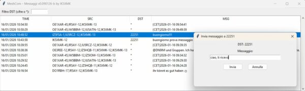 Il programma mc_messages lavora sui gruppi (campo DST). In alto a sinistra è possibile impostare un filtro sui gruppi relativamente ai messaggi in arrivo da visualizzare (es. 22251 o 222*). In occasione di una specifica operatività (es. esercitazione) possiamo predisporre un gruppo esclusivo da attenzionare. Facendo click con il mouse sul campo DST di un messaggio si apre una finestra ove è possibile trasmettere una risposta che verrà inviata alla scheda lora.
