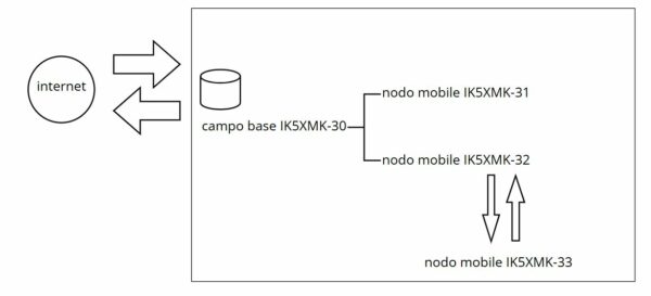 Ogni stazione lora meshcom ha un proprio identificativo (callsign radioamatoriale con ssid) che la rende univoca. Di seguito uno schema rappresentativo, che, come già detto, non ha velleità particolari se non quello di esercizio operativo amatoriale e di programmazione: