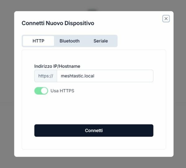 Vediamo che la selezione del protocollo HTTPS risulta disattivata, possiamo digitare l’IP del nostro nodo Meshtastic: