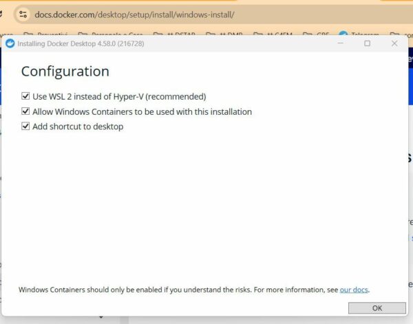 A questo punto è possibile proseguire installando Docker Desktop per Windows ovvero l’ambiente grafico che farà girare il “contenitore” del software. Scaricare il programma da questo indirizzo ed eseguirlo. Confermare le scelte selezionate e proseguire: