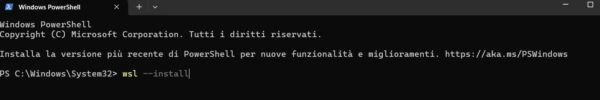 Il primo passo è quello di installare sul proprio PC il sottosistema Windows per Linux ovvero WSL. E’ richiesto Windows 10 oppure 11. Aprire una finestra Windows PowerShell (menu Start e digitare PowerShell) e digitare il comando “wsl –install” :